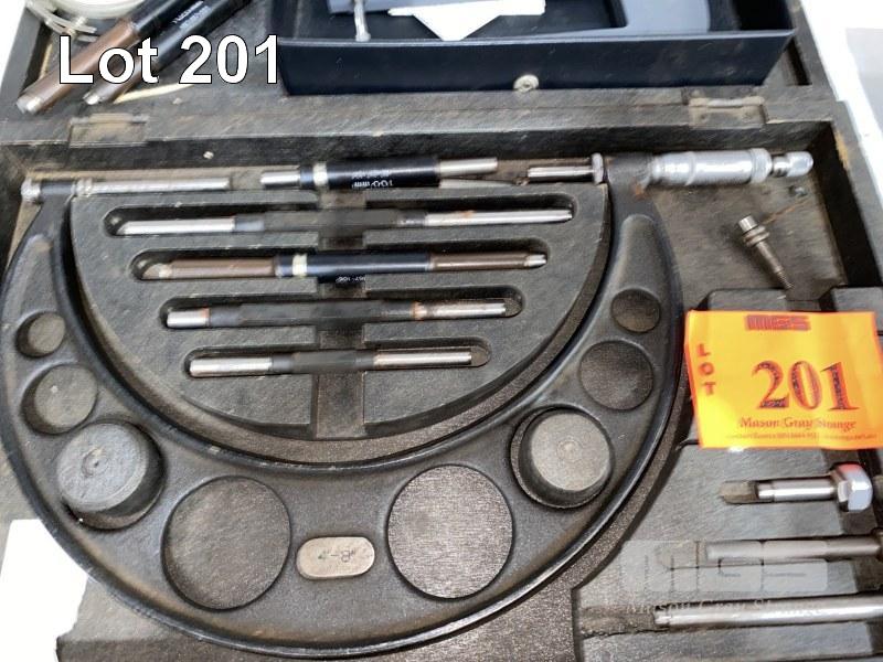 MOORE & WRIGHT MICROMETER, 4-8", MITUTOYO POST MIC, 0-25mm, 2 x THICKNESS MICS, MAGNETIC STAND, ETC