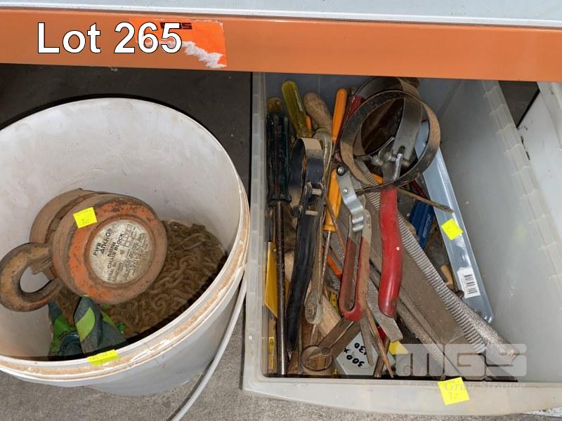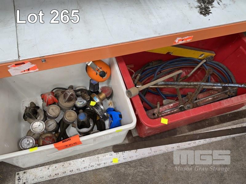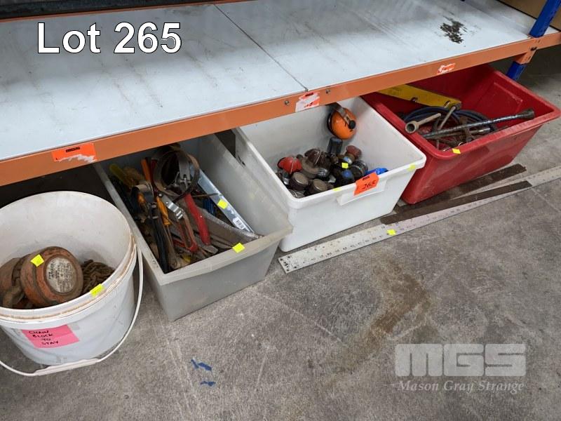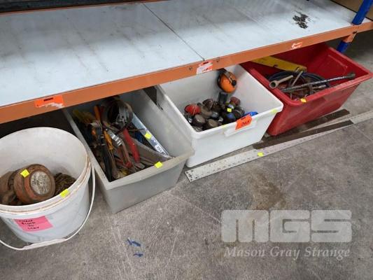 OXY ACETYLENE REGS, HOSE & TORCH, ANCHOR CHAIN BLOCK, HAND TOOLS, ETC, 4 x TUBS