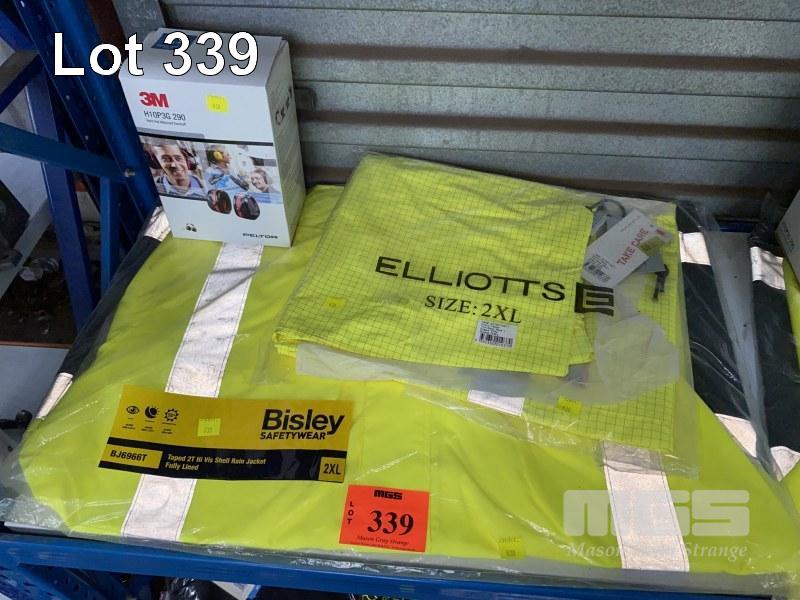 1 x ELLIOTTS HI-VIS RAIN COAT, YELLOW, 2XL, 1 x BISLEY HI-VIS REFLECTIVE RAPED SHELL RAIN JACKET, BLUE/YELLOW, 2XL WITH PAIR 3M PELTOR HARD HAT ATTACHED EAR MUFFS