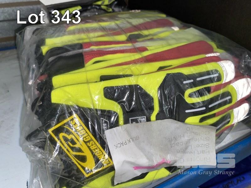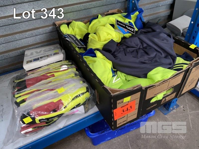 9 x HI-VIS WORK SHIRTS, JBS, BIZ, ETC, SIZES, 3XL, 5XL, ETC & 10 x PAIRS RIGGERS GLOVES, SIZE LARGE, HI-VIS KNUCKLE PROTECTION WITH 5 x PAIRS SAFETY GLASSES, UVEX PHEOS