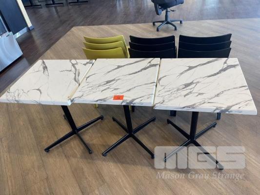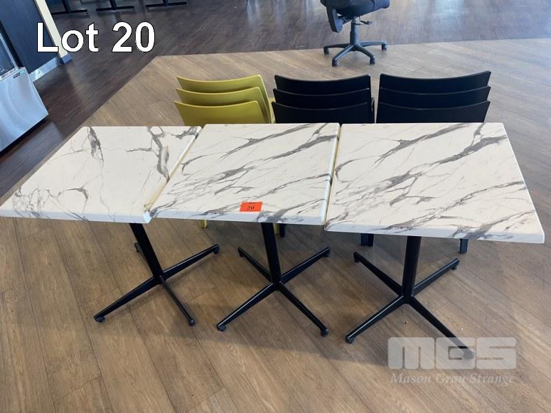3 x ALFRESCO TABLES, 60 x 60cm, MARBLE LOOK ACRYLIC TOPPED, SINGLE PEDESTAL BASE
