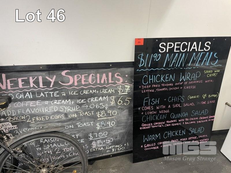 2 x MENU BOARDS, BLACK PERSPEX & CHALKBOARD
