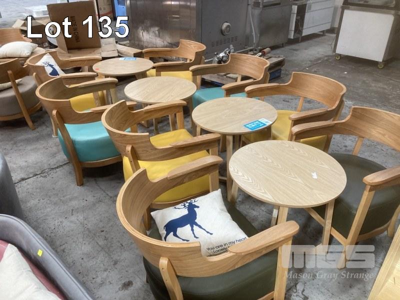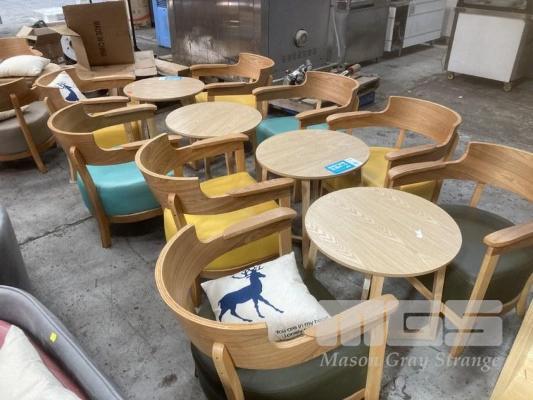5 x 3 PIECE CAFE SETTINGS, 60cm DIAMETER TABLE, CURVED BACK ARM CHAIRS, BEECH TIMBER