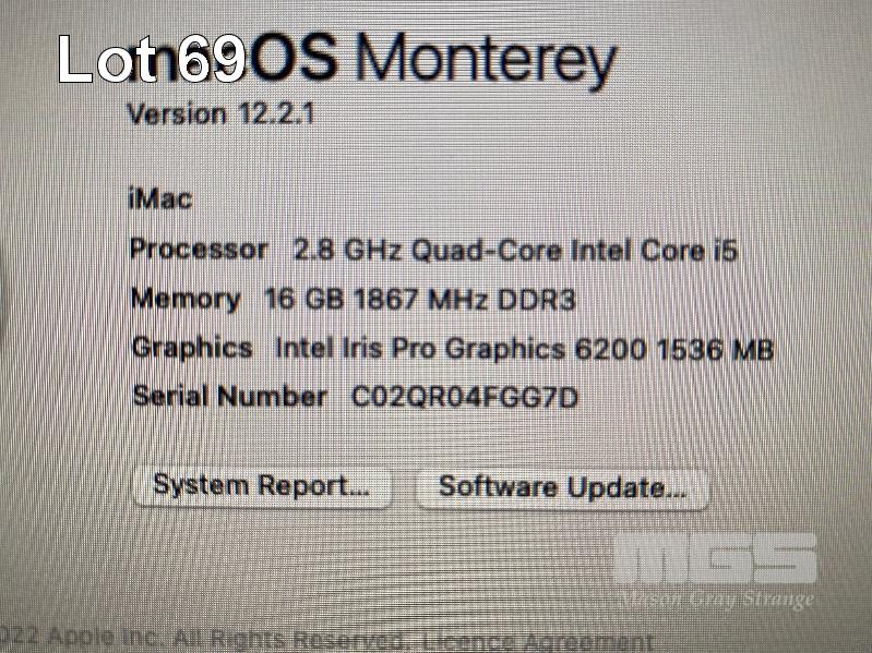 APPLE iMAC (A1418), CORE i5 5575R (5TH GEN) @ 2.8GHz, 16GB DDR3 RAM, 256GB SSD, BUILT-IN 21.5" DISPLAY (1920x1080), INTEL IRIS PRO GRAPHICS 6200, Wi-Fi, MAC OS 12 INSTALLED (NO KEYBOARD, NO MOUSE, NO CABLE) S/N:C02QR04FGG7D