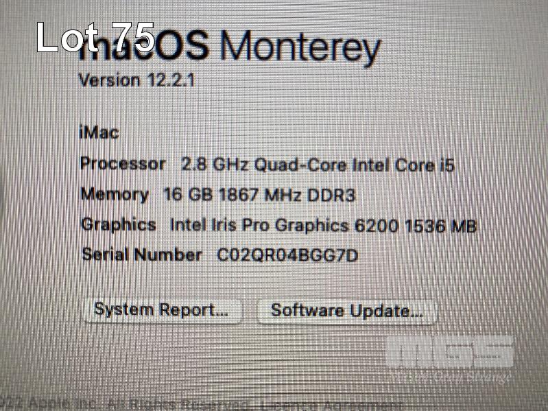 APPLE iMAC (A1418), CORE i5 5575R (5TH GEN) @ 2.8GHz, 16GB DDR3 RAM, 256GB SSD, BUILT-IN 21.5" DISPLAY (1920x1080), INTEL IRIS PRO GRAPHICS 6200, Wi-Fi, MAC OS 12 INSTALLED (NO KEYBOARD, NO MOUSE, NO CABLE) S/N:C02QR04BGG7D