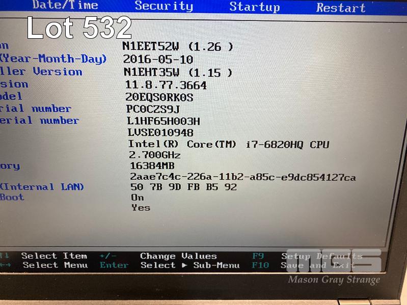 LAPTOP, LENOVO THINKPAD P50 MOBILE WORKSTATION, TYPE 20EQ, CORE i7 6820HQ (6TH GEN) @ 2.7GHz, 16GB DDR4 RAM, 256GB SSD, 15.6" WIDESCREEN (1920x1080), 4GB NVIDIA QUADRO M2000M VIDEO, Wi-Fi, BLUETOOTH, WINDOWS 10 PRO INSTALLED & POWER SUPPLY (NOTE: MESSAGE ON STARTUP "FAN ERROR", MARKS ON SCREEN) S/N:PC0CZS9J