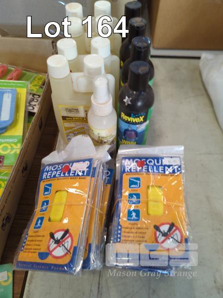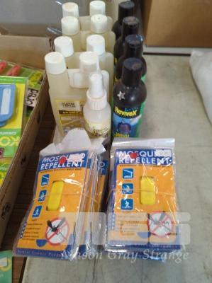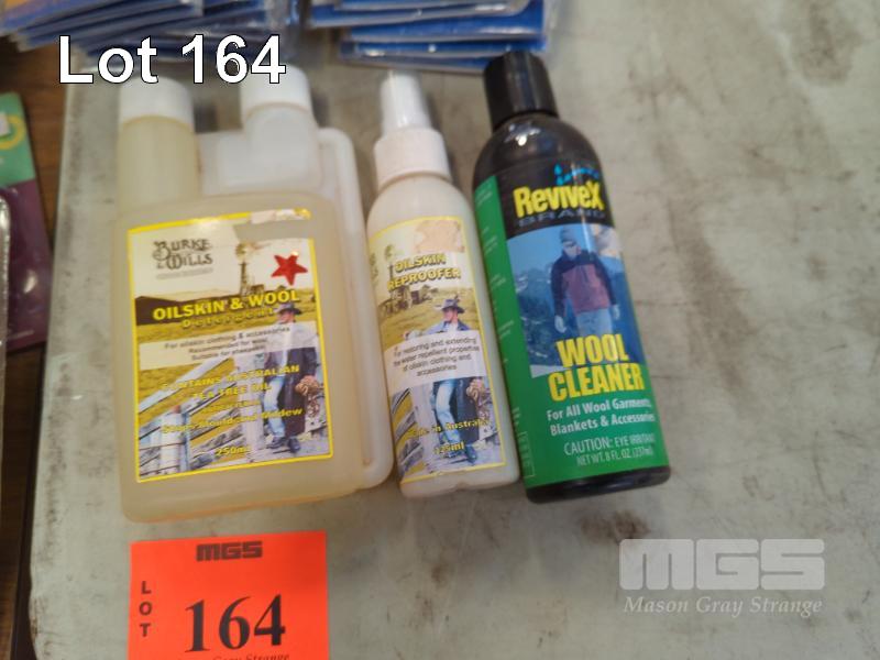 BURKE & WILLS OIL SKIN & WOOL DETERGENT, REVIVEX WOOL CLEANER AND 20 X MOSQUITO REPELLENT WRISTBANDS.