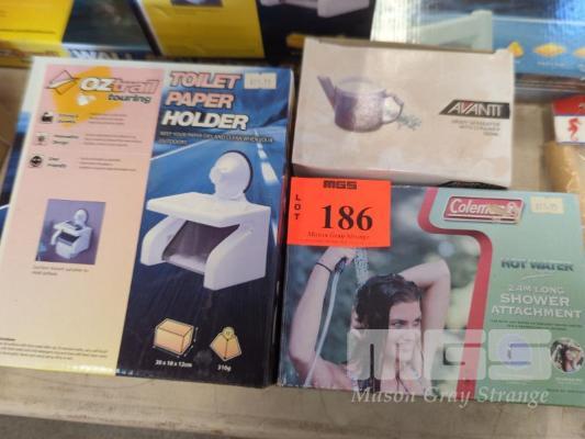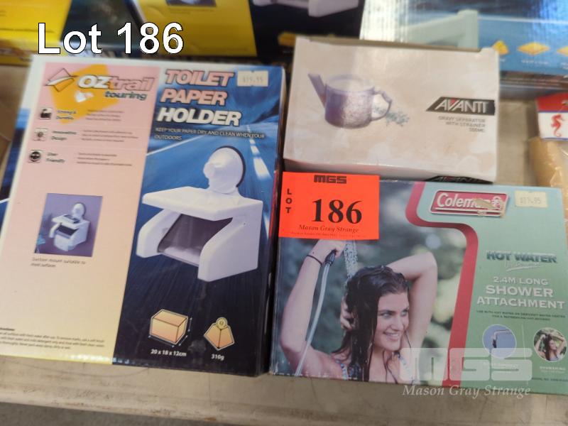 OZTRAIL "TOURING" TOILET PAPER HOLDER. COLEMAN 2.4M LONG HOT WATER SHOWER ATTACHMENT AND AVANTI 500ML GRAVY SEPARATOR WITH STRAINER.