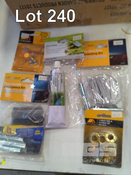 QUANTITY OF REPAIR KITS, PARTS AND ACCESSORIES. INCLUDES OZTRAIL TENT DOCTOR EMERGENCY KITS & DOME TENT POLE RETHREADING KITS, TENT SEAM SEALER, TENT EYELET TOOL & EYELET SETS, ROPE SPLICE CLIPS, SPRING BUTTON CLIPS ETC. 1 X BOX, 30 ITEMS APPROX.