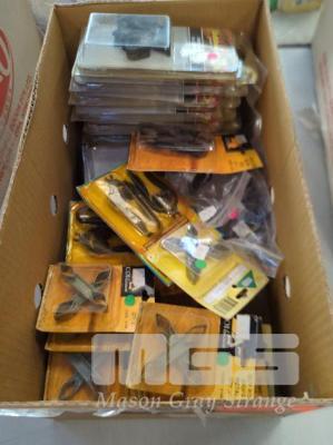 QUANTITY OF TENT GUY ROPE ACCESSORIES IN PACKS, ASSORTED TYPES & SIZES. INCLUDES GUY ROPE METAL GRIPS, HOLESS ROPE TIES, ROPE RUNNER V CLAMPS, GUY ROPE GRIPS ETC. 1 X BOX, 35 PACKS APPROX.