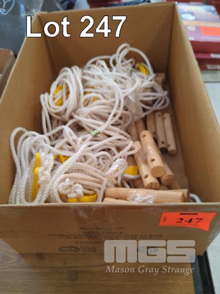 NYLON GUY ROPES WITH TENSIONERS AND QUANTITY OF WOODEN TENSIONERS. ALL LOOSE. 1 X BOX.