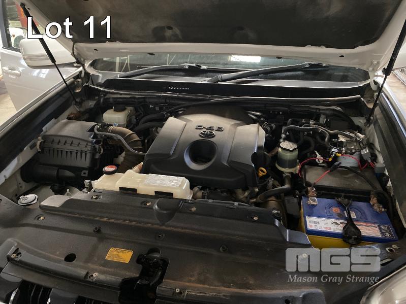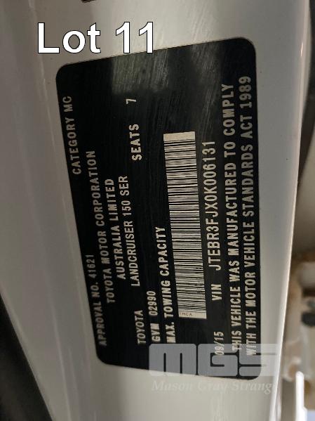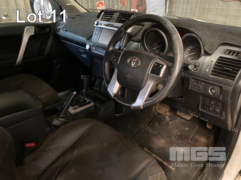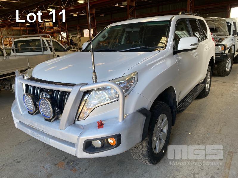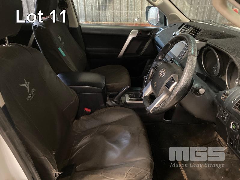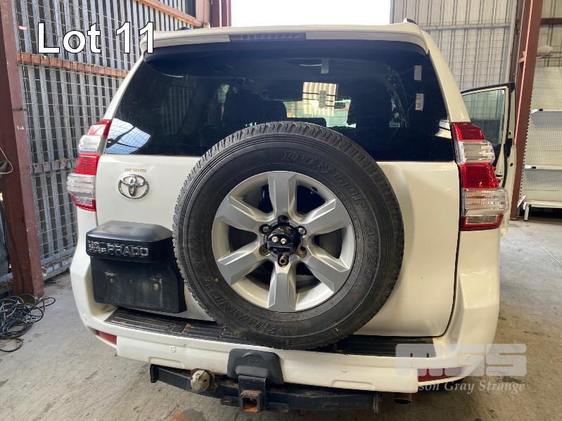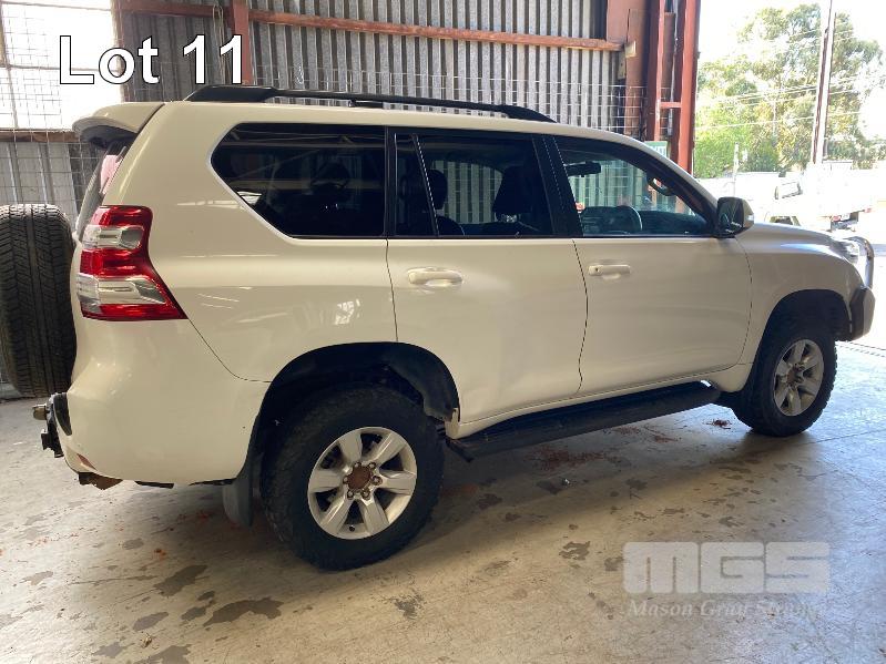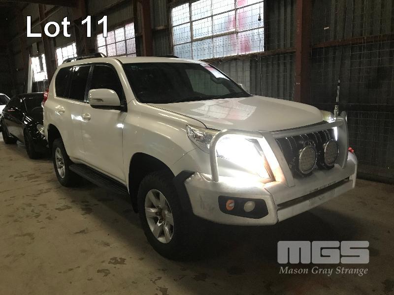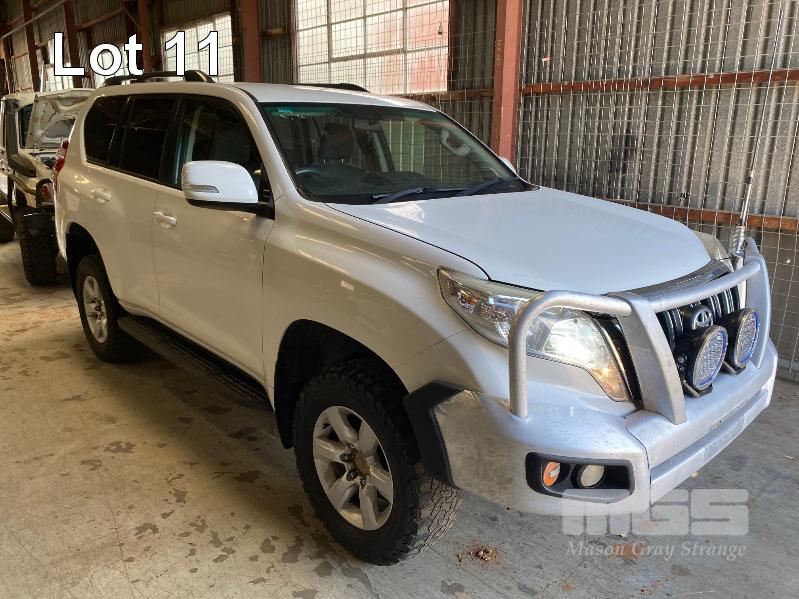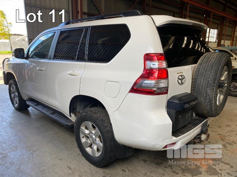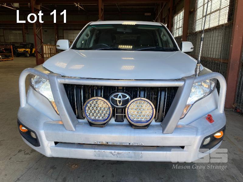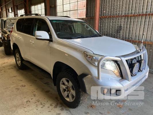 2015 TOYOTA LANDCRUISER PRADO 150 SERIES WAGON 4x4 VIN: JTEBR3FJX0K00631 ENG: 1GD8016271 ODO: 273,628kms SHOWING D4D DIESEL ENGINE, 4 SPEED AUTOMATIC TRANSMISSION, WHITE DUCO, 5 DOORS, 7 SEAT, 4x4 ABS, AIR BAG, AIR CON, ALLOY WHEELS, BLUETOOTH, BULL BAR, CD PLAYER, CENTRAL LOCKING, CRUISE CONTROL, FOG LAMPS, IMMOBILISER, POWER STEERING, POWER WINDOWS, ROOF RACKS, SAT NAV, SIDE STEP, SPARE WHEEL, SPOT LIGHTS, TOW BAR, TRACTION CONTROL (WITH 2 KEY/S, WITH OWNER'S MANUAL, WITH SERVICE BOOKS) CONDITION: - Note: Ex Mine Car