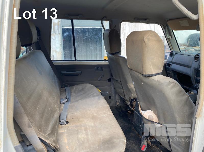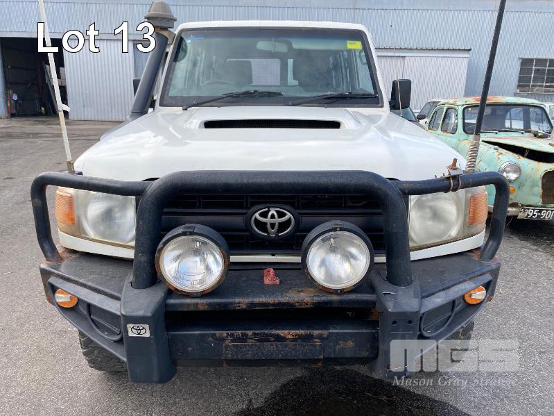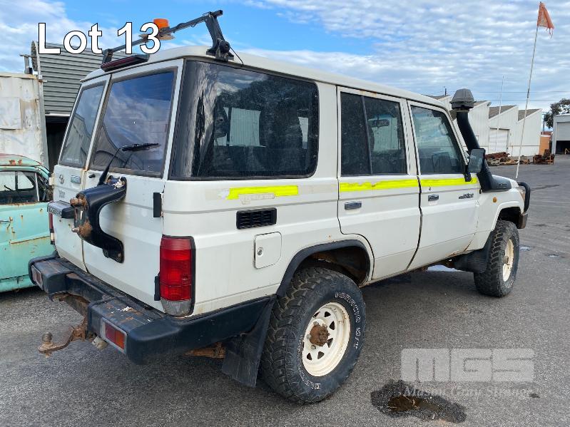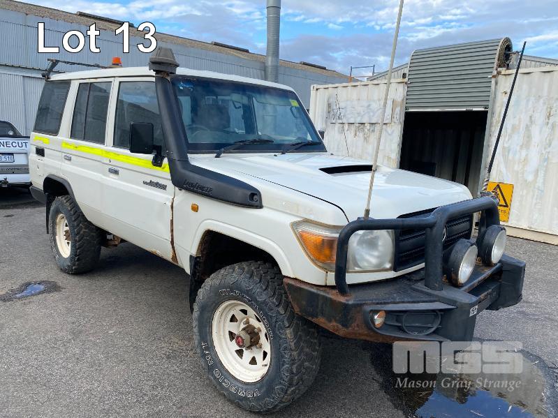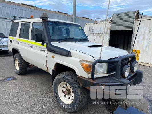 2010 TOYOTA LANDCRUISER WAGON 4WD REG: NO PLATES VIN: JTEEV73J00004968 ODO: 321,453 kms INDICATED V8, 5 SPEED MANUAL, WHITE DUCO, 5 DOORS, 5 SEAT, 4WD AIR BAG, BULL BAR, CD PLAYER, FOG LAMPS, POWER STEERING, SPOT LIGHTS, TOW BAR, EX MINE VEHICLE (NO PAPERS, WITH 2 KEY/S, NO OWNER'S MANUAL, NO SERVICE BOOKS) CONDITION: LEFT SIDE - DENTS, SCRATCHES, RUST