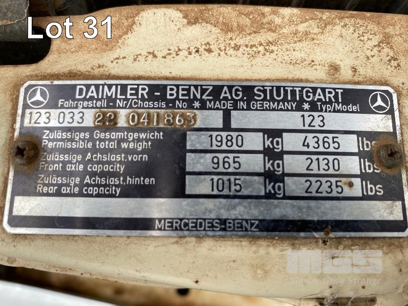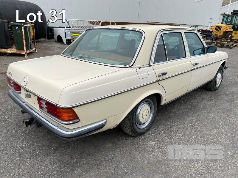 1978 MERCEDES BENZ 280E SEDAN REG: NO PLATES VIN: 123 033 22 041863 ENG: 11098422040635 ODO: 304,533 kms INDICATED 6 CYLINDER, AUTO, PETROL, CREAM DUCO, 4 DOORS, 5 SEAT, NOT STARTING KEY #14 (NO PAPERS, WITH 1 KEY/S, WITH OWNER'S MANUAL, NO SERVICE BOOKS)