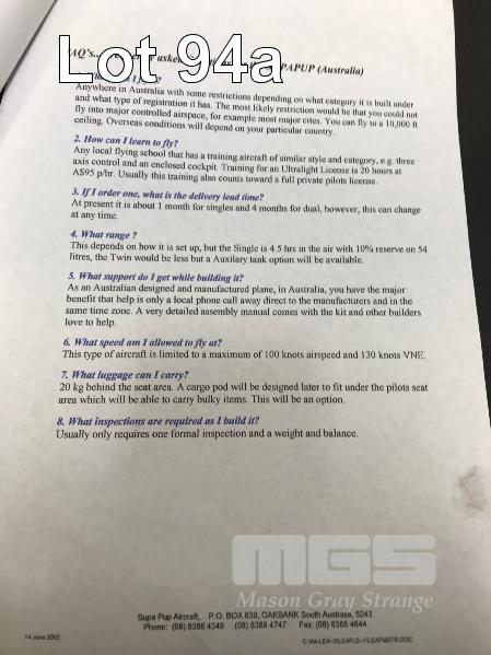 SUPERPUP MARK IIII KIT AIRCRAFT SOUTH AUSTRALIAN DESIGNED/BASED COMPANY PARTLY COMPLETED PROJECT (ABONDONED DUE TO POOR HEALTH) ALL COMPONENTS ARE INCLUDED IN THE PACKAGE FUSELAGE HAS BEEN PROFESSIONALLY WELDED MORE CONSTRUCTION NEEDED THAN PREVIOUS AIRCRAFT SOLD DIAMENSIONS LENGTH - 5.7 MTRS WING SPAN - 7.9 MTRS WING AREA - 9.5 SQ MTRS ASPECT RATIO - 6.5 WING CHORD 1.225 MTRS DIHEDRAL - 2 DEG EMPTY WEIGHT - 200 KGS MAX T.O WEIGHT - 340 KGS FUEL CAPACITY - 54 LTR CRUISE AIRSPEED - 185 KM/H STALL AIRSPEED - 66 KM/H SWING BACK WINGS, FOLD UNDER 2.43 MTRS AND CAN BE MOVED AND STORED IN TRAILER. FABRICATED FUSELAGE STANDS INCLUDED & ASSORTED JIGS FOR COMPONENTS FUSELAGE COST TO DATE 26-28K (NO PAPERS, NO OWNER'S MANUAL, NO SERVICE BOOKS)