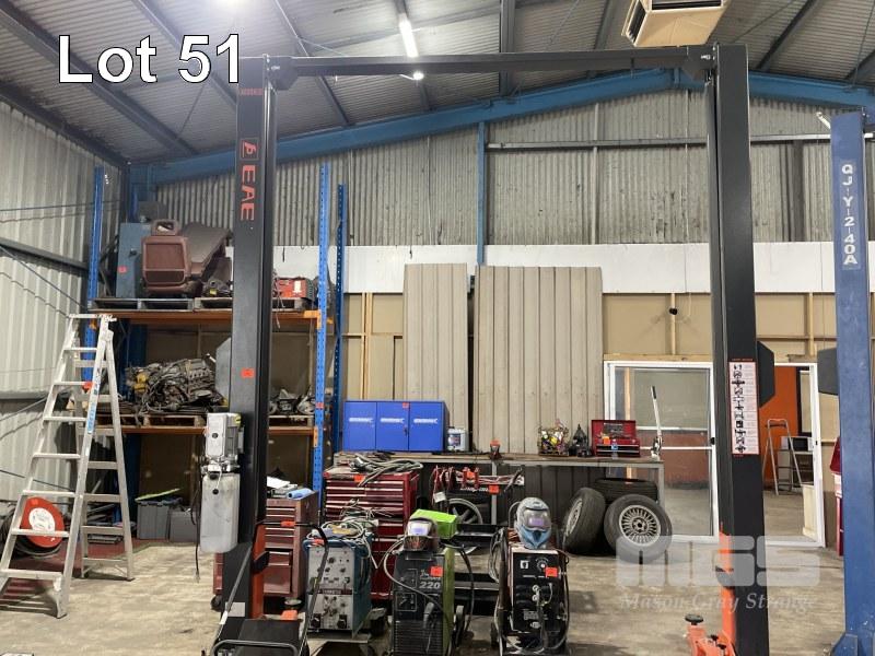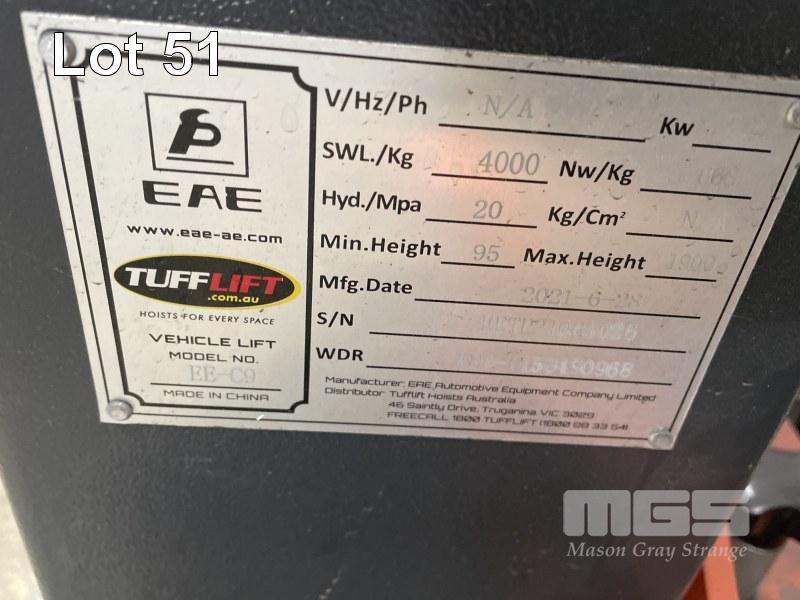 VEHICLE HOIST, 2 POST CLEAR FLOOR, TUFF LIFT, MODEL: EE-C9, 4000kg CAP, 240v, DOM 2021