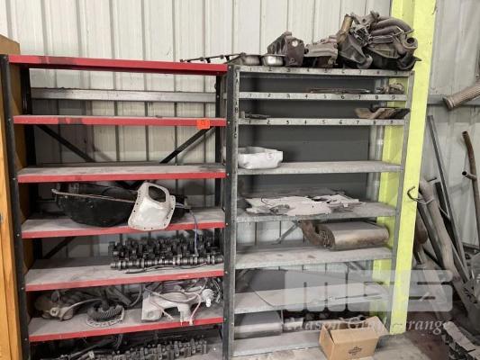 2 x STEEL RACK PLUS ASSORTED ENGINE PARTS, MUFFLERS ETC.