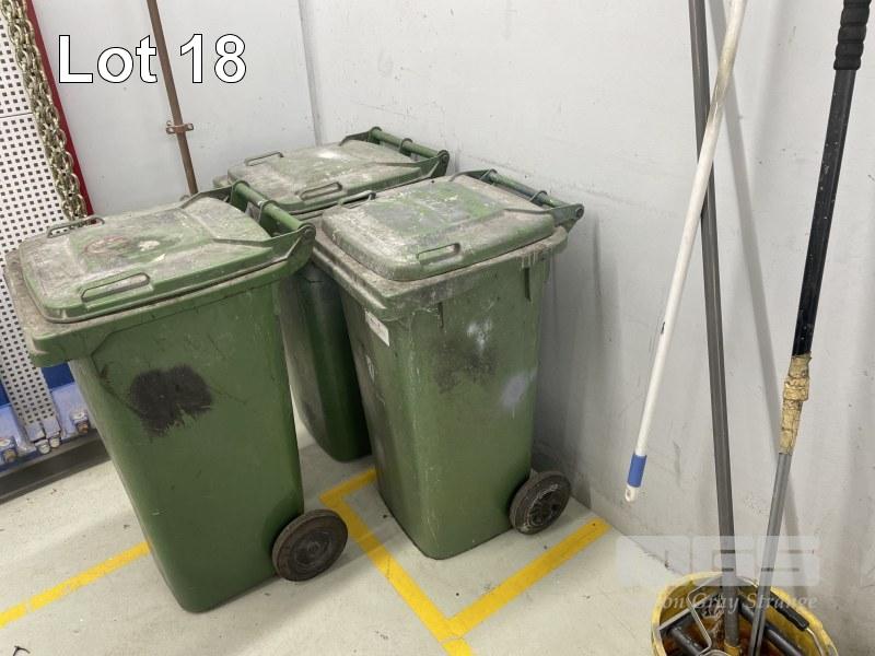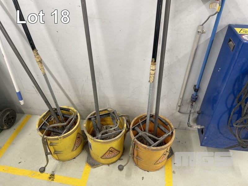 3 x WASTE BINS, MOPS, BUCKETS BROOMS ETC.
