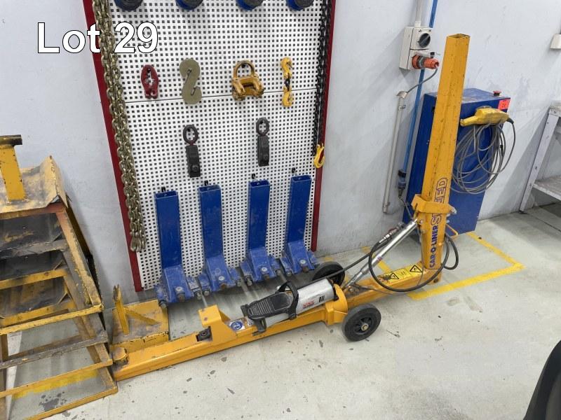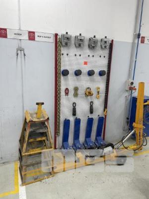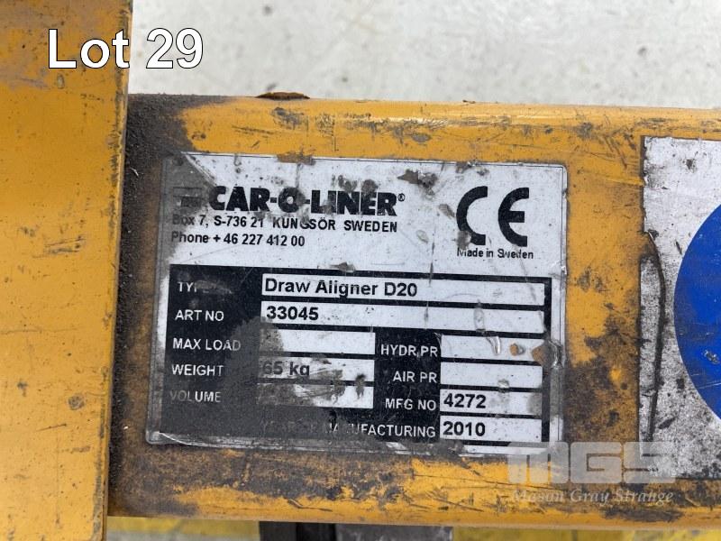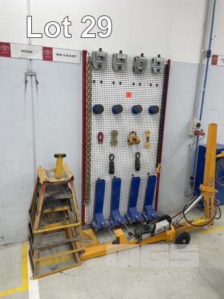 CHASSIS PULL SYSTEM, SUIT CAR-O-LINER SCISSOR HOIST, TO INCLUDE, CAR-O-LINER 4 TONNE ARM, DOM: 2011, + SHADOW BOARD OF TOOLING, CLAMPS, FEET, CHAIN HOLDERS & EXTENSIONS, WITH WHEEL STANDS & CHASSIS STANDS