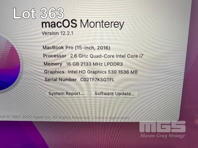 LAPTOP, APPLE MACBOOK PRO (A1707), CORE i7 6700HQ (6TH GEN) @ 2.6GHz, 16GB DDR3 RAM, 256GB SSD, 15.4" RETINA DISPLAY (2880x1800), INTEL HD GRAPHICS 530, THUNDERBOLT 3, TOUCHBAR, Wi-Fi, MAC OS 12 INSTALLED (NO USB-C POWER SUPPLY) (NOTE: MINOR MARKS ON SCREEN, SMALL DENT ON CORNER OF CASING) S/N:C02TF7KSGTFL