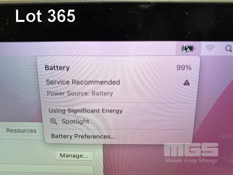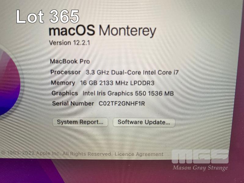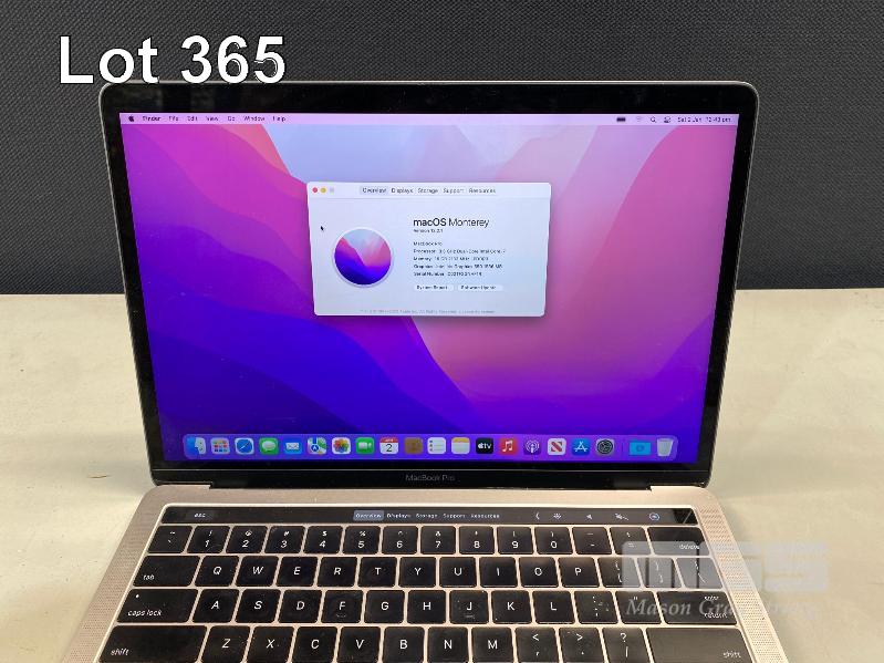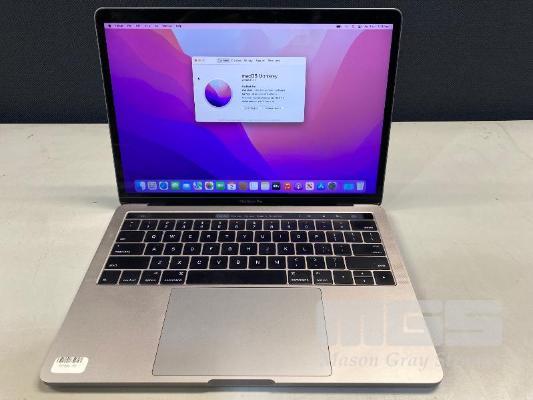 LAPTOP, APPLE MACBOOK PRO (A1706), CORE i7 6567U (6TH GEN) @ 3.3GHz, 16GB DDR3 RAM, 512GB SSD, 13.3" RETINA DISPLAY (2560x1600), INTEL IRIS GRAPHICS 550, THUNDERBOLT 3, TOUCHBAR, Wi-Fi, MAC OS 12 INSTALLED (NO USB-C POWER SUPPLY) (NOTE: MINOR MARKS ON SCREEN, MESSAGE "BATTERY SERVICE RECOMMENDED") S/N:C02TF2GNHF1R
