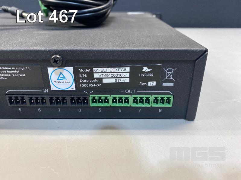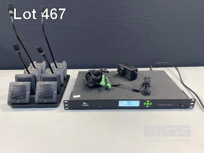 REVOLABS EXECUTIVE ELITE 8-CHANNEL WIRELESS SYSTEM, MODEL 01-ELITEEXEC8 INCLUDING - 2 x GOOSENECK 12" MICROPHONES, 01-ELITEMIC-GN12 - 2 x GOOSENECK 6" MICROPHONES, 01-ELITEMIC-GN6 - 2 x DIRECTIONAL TABLETOP MICROPHONES, 01-ELITEMIC-DR - 2 x OMNIDIRECTIONAL TABLETOP MICROPHONES, 01-ELITEMIC-OM WITH ELITE 8 MIC CHARGER TRAY & POWER SUPPLY S/N:VT4910001057