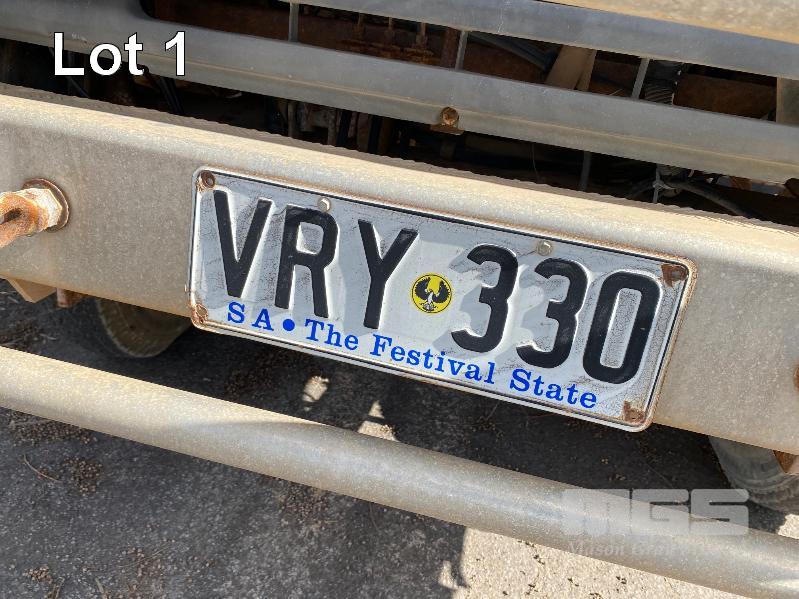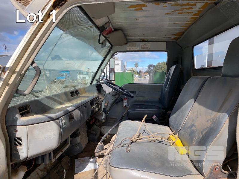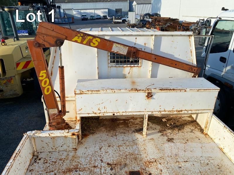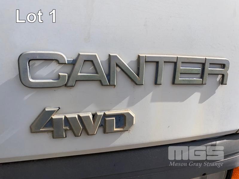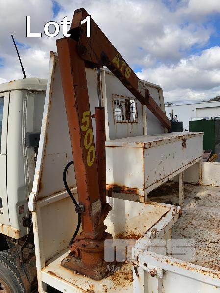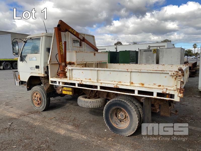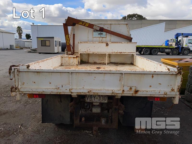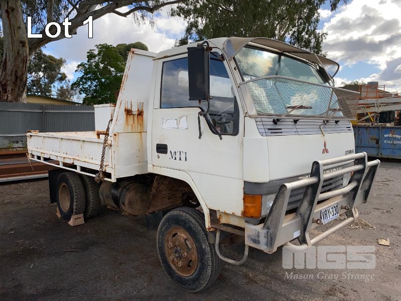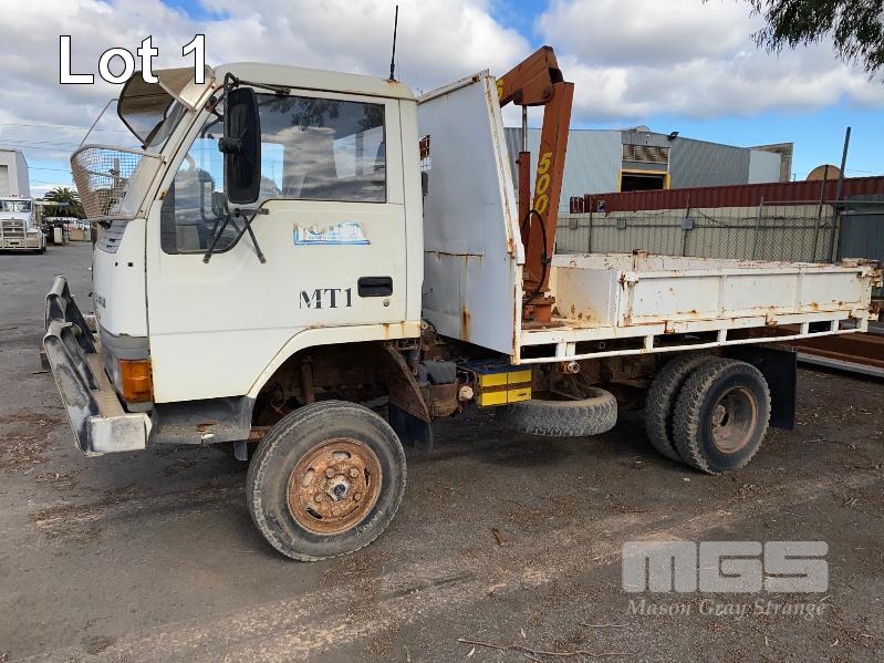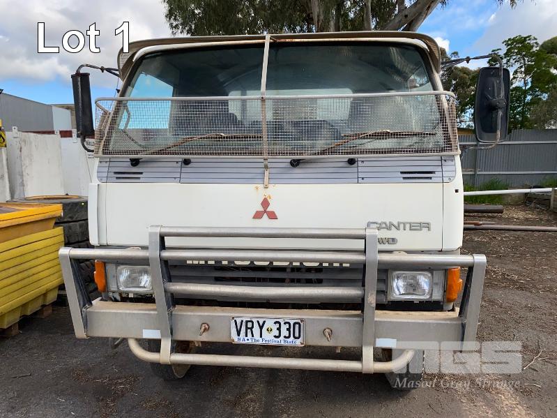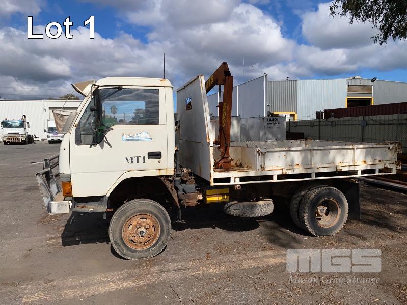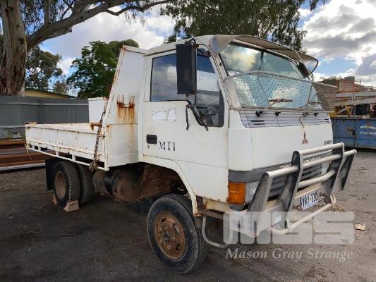 1989 MITSUBISHI CANTER 4x4 TIPPER REG: VRY 330 (SA) ODO: 215,603kms SHOWING 4 CYLINDER DIESEL, 5 SPEED MANUAL TRANSMISSION, SPRING SUSPENSION, WHITE DUCO, 2 DOORS, 3 SEAT, BULL BAR, ROCK SCREEN, VISOR, STEEL TIPPER BODY WITH HINGED SIDES & REAR, TOW BALL FITTED WITH HIAB CRANE BEIND CAB 500kg ATS TOOLBOX SPARE WHEEL KEY #32 (WITH 1 KEY/S) CONDITION: BRAKES - ALL FAULTS - NO COMPLIANCE OR MANUFACTURING PLATES