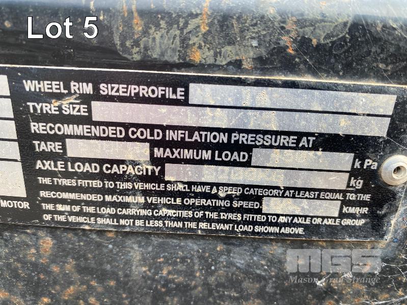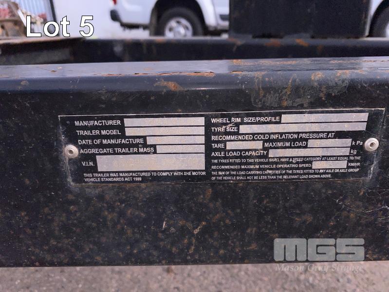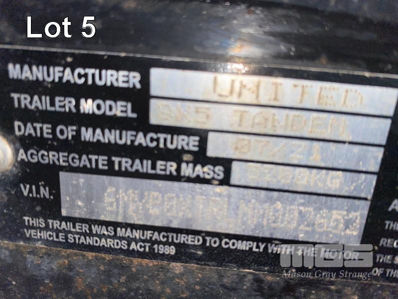 2021 UNITED 8'8" x 5'2" (2700x1600mm) TANDEM AXLE PLANT TRAILER REG: S230 TIX (SA) VIN / CHASSIS: 6MYB0XTRLMM002652 ATM: 3,200kg BALL HITCH, BRAKES, ARK BREAK AWAY SYSTEM HINGED REAR LOADING RAMPS TYRE SIZE :185R14C SPARE WHEEL MASS: 650kg BLACK (WITH PAPERS)