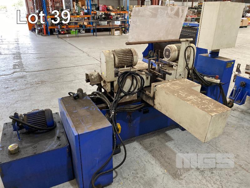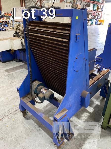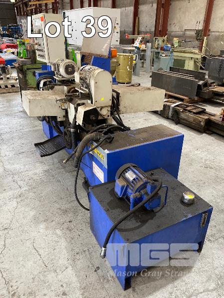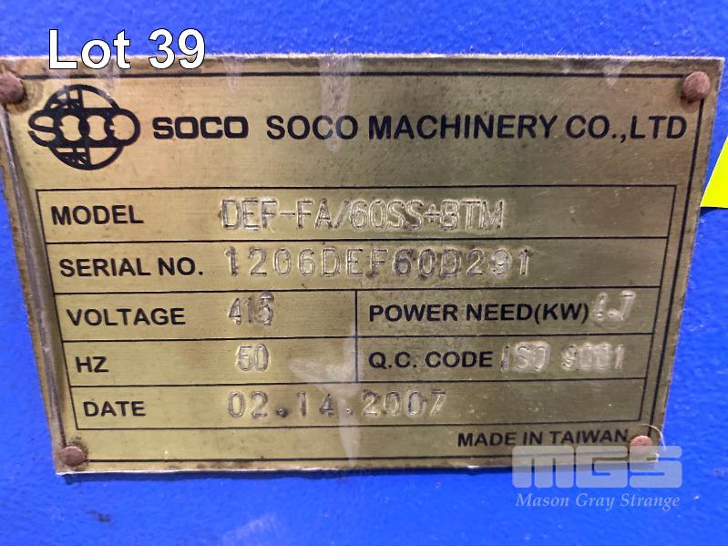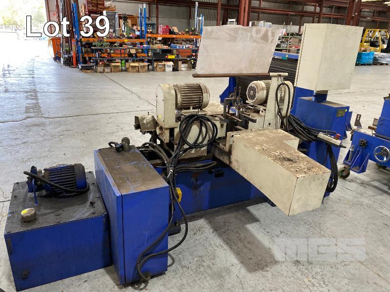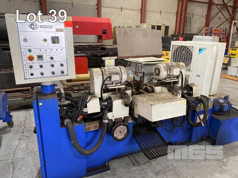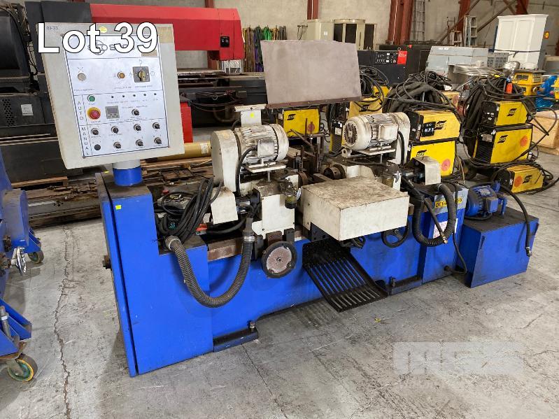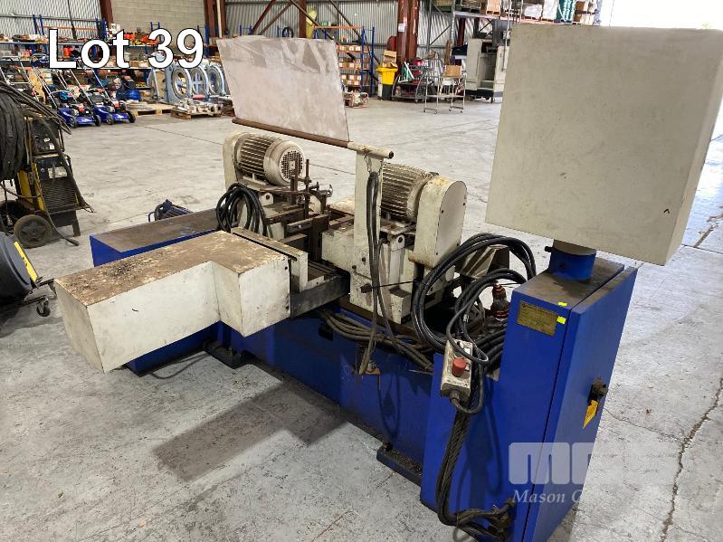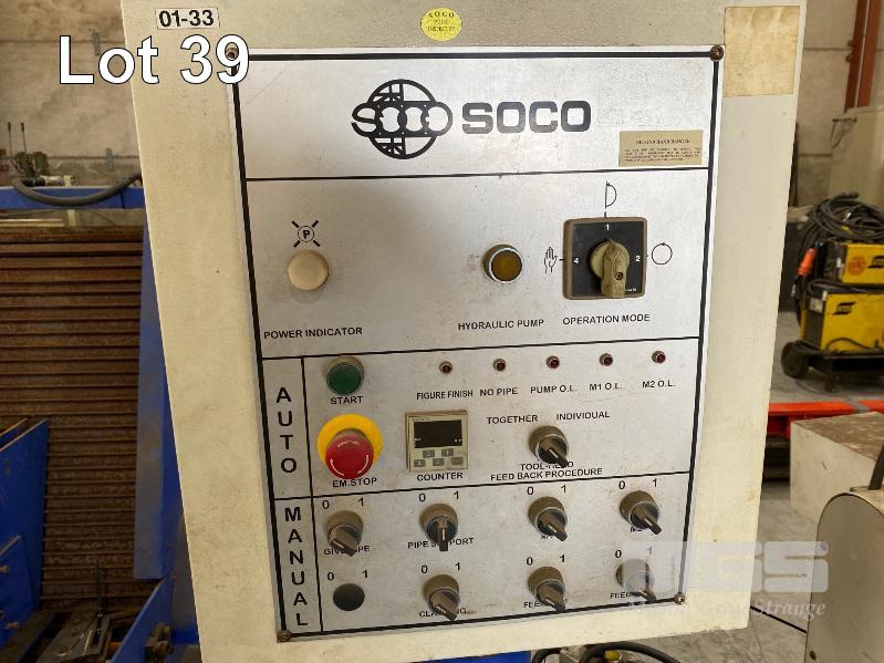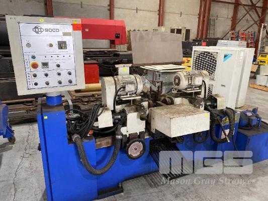TUBE CHAMFERING MACHINE, SOCO MOD: DEF-FA/60SS+BTM DOM: 2007 WITH AUTO ON PENDANT CONTROL DUAL END CHAMFERING WITH HYDRAULIC POWER UNIT & ELEVATED CONVEYOR UNIT, ROTARY STEEL SLOT/ANGLE FEED 600 (W) TO 1300mm (H), 1400mm (L), 415V, MOBILE WITH ATTACHMENT, ADJUSTABLE WIDTH IN FEED, HEAVY DUTY STEEL CONSTRUCTION