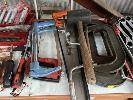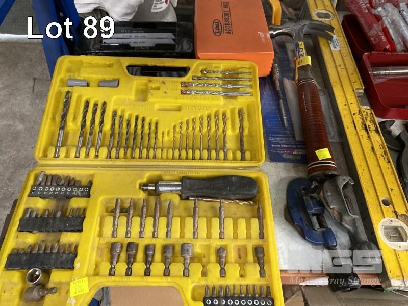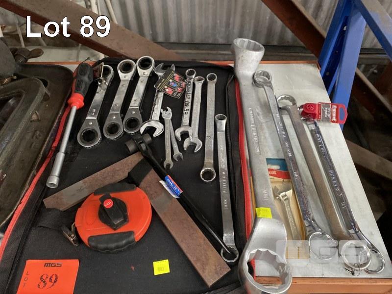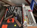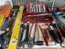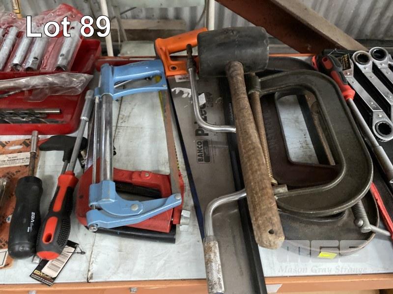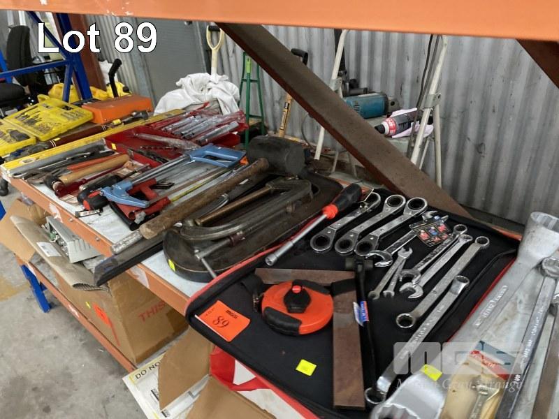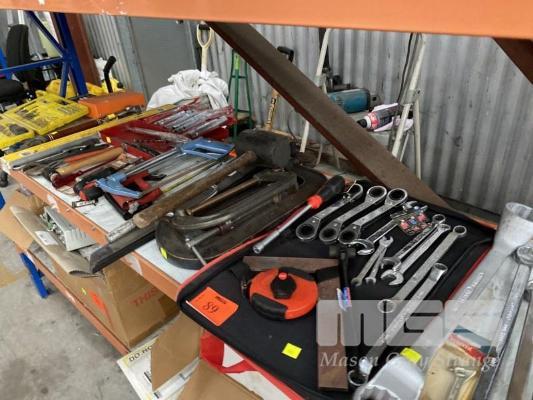 ASSORTED HAND TOOLS INCLUDING RATCHET RING SPANNERS, SIDCHROME RING SPANNERS, G-CLAMPS, HACK SAWS, SHIFTERS, HAMMERS, DRIVE BIT SETS, ETC