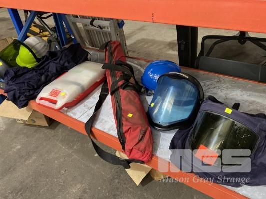 HIGH VOLTAGE PROTECTIVE EQUIPMENT INC CATU RUBBER SAFETY MAT IN CARRY BAG, ARC FLASH PROTECTIVE HOOK & FACE SHIELD WITH 12 CAL PROTECTIVE TOP, GLOVES, 2 x FACE SHIELDS & HARD HATS