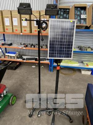 SOLAR PANELS & TWIN HALOGEN LIGHT ON STANDS WITH WATER PUMP, 12V