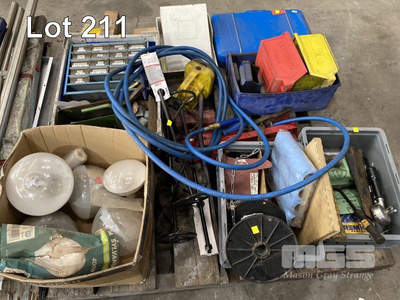 3 x PAINT/MORTAR MIXERS, PUNCHES, CHAIN, WEDGES, SLEDGE HAMMER HEAD, PARTS DRAWERS, SEALERS, CAMP OVEN, HEATERS, ETC