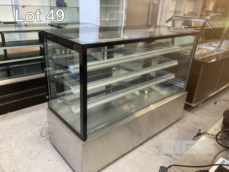 SQUARE GLASS CAKE DISPLAY, FED MOD: SL88OV 180cm, SELF CONTAINED UNIT, 240V (NOTE: SOME MINOR CHIPS)