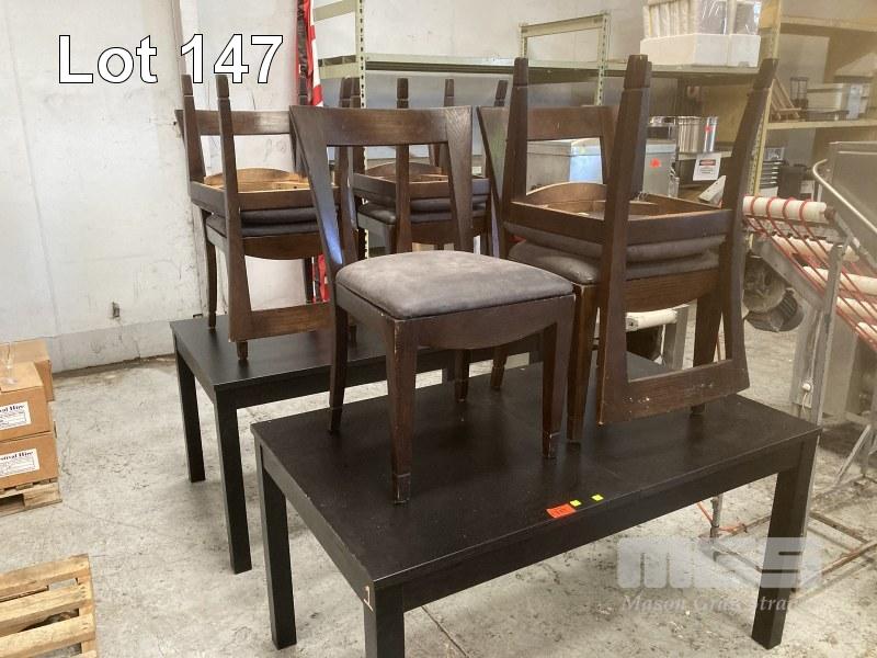2 X EXTENSION TABLES, 140 X 85CM, DARK STAIN & 7 CHAIRS