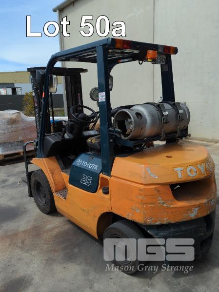 TOYOTA 2.5 TONNE FORKLIFT, REGO: S01SRX, MODEL:42-7FG25, CHASSIS: 407FG25-25813, 3 STAGE CONTAINER MAST, SIDE SHIFT, LPG, WEIGH SCALE-2.5T, 6,879hrs, SOLID TYRES, HAZARD & DRIVING LIGHTS, WITH MIRRORS