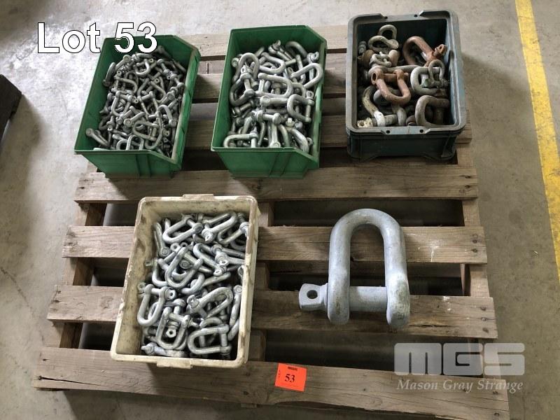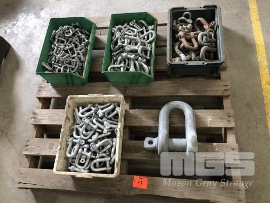 3 x TUBS VARIOUS SIZE SHACKLES, GALV & PLATED, APPROX 200 PIECES, PLUS 1 x 35 TONNE SHACKLE