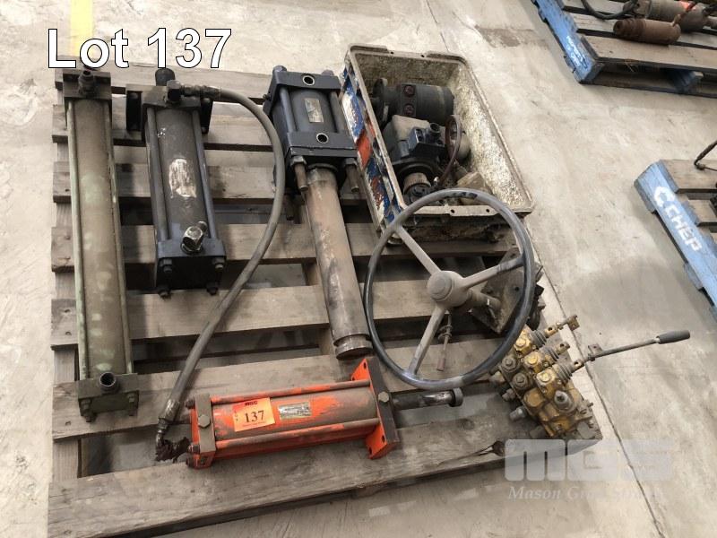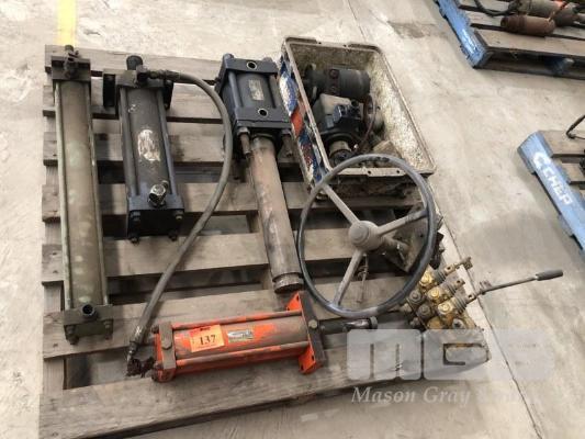 PALLET LOT HYDRAULIC COMPONENTS, PUMPS, RAMS, CONTROL BOX, STEERING WHEEL ETC.