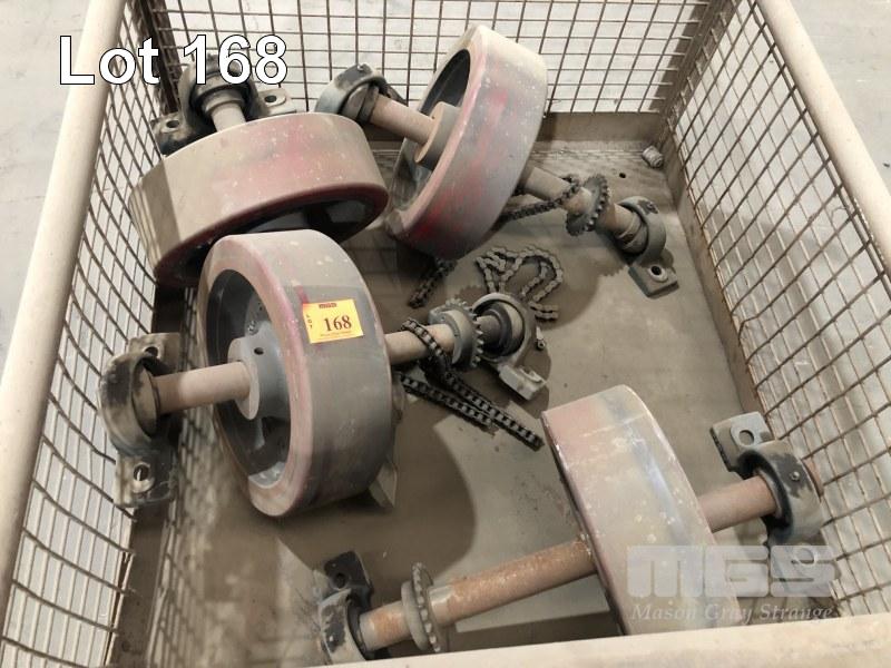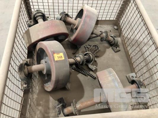 4 x LARGE NYLON CASTOR WHEELS, RICHMOND, 400 x 125mm WITH SHAFTS, BEARING BLOCKS & DRIVE CHAINS, (STILAGE NOT INCLUDED)