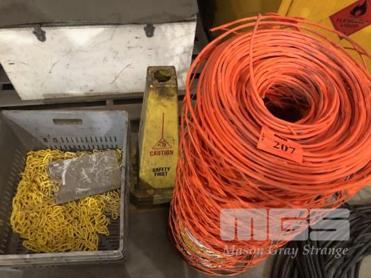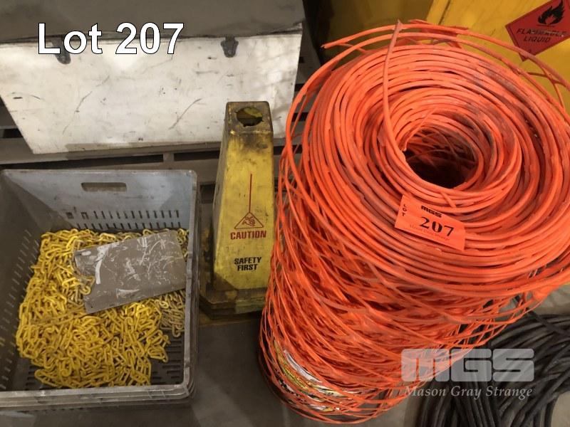 1 x ROLL ORANGE SAFETY BARRIER, 1m (H) x 30m (L), PLUS TUB OF YELLOW PLASTIC CHAIN, 2 x CAUTION CONES
