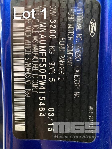 2015 FORD PX RANGER XLT CREWCAB UTILITY 4X4 REG: AEH181 (VIC) (EXPIRED) VIN: MNAUMFF50FW415464 ENG: P5AT2015708 ODO: 211,081 3.2 LTR TURBO DIESEL, 6 SPEED AUTO, AURORA BLUE, 4 DOORS, 5 SEAT, 4X4 ABS, AIR BAG, AIR CON, ALLOY WHEELS, BLUETOOTH, CD PLAYER, CENTRAL LOCKING, CRUISE CONTROL, FOG LAMPS, IMMOBILISER, POWER STEERING, POWER WINDOWS, SIDE STEP, SPARE WHEEL, TOW BAR (NO PAPERS, WITH 1 KEY/S, WITH OWNER'S MANUAL, WITH SERVICE BOOKS) CONDITION: ENGINE - OIL LEAK ***KEY 1 *** -