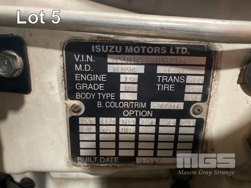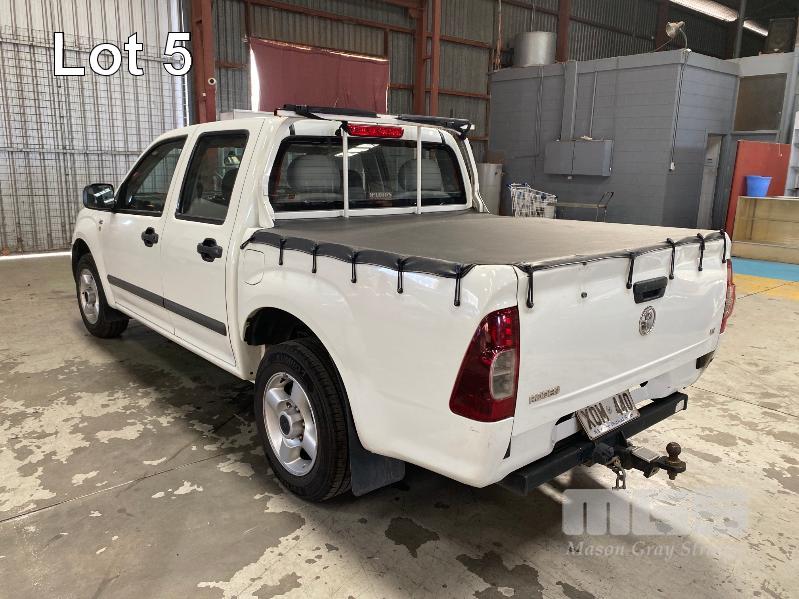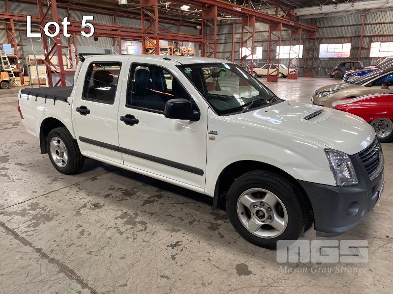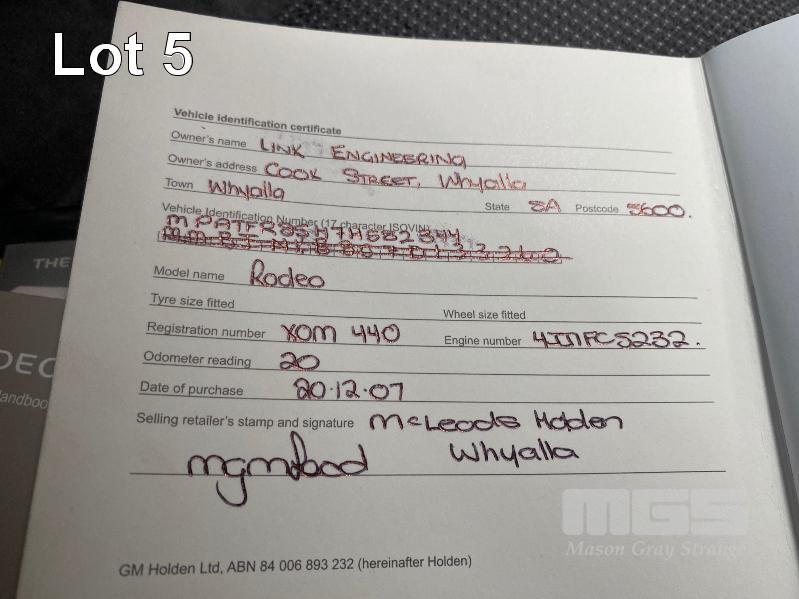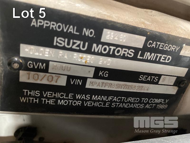 2007 HOLDEN RA RODEO LX DUAL CAB UTILITY REG: XOM 440 (SA) VIN: MPATFR85N7H582344 ENG: 4JJ1FC5232 ODO: 279,143kms SHOWING 3.0 LITRE VCDi, 5 SPEED MANUAL TRANSMISSION, TURBO DIESEL, WHITE DUCO, 4 DOORS, 5 SEAT, ABS, AIR BAG, AIR CON, ALLOY WHEELS, CD PLAYER, CENTRAL LOCKING, CRUISE CONTROL, IMMOBILISER, POWER STEERING, POWER WINDOWS, SPARE WHEEL, TONNEAU COVER, TOW BAR (WITH PAPERS, WITH 1 KEY/S, WITH OWNER'S MANUAL, WITH SERVICE BOOKS) CONDITION: BONNET & ROOF - HAIL DAMAGE RHS GUARD - MINOR DAMAGE