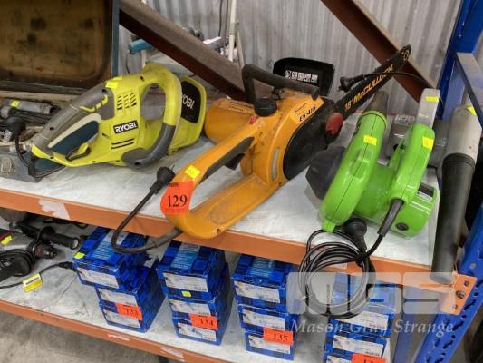 RYOBI HEDGE TRIMMER, MCCULLOCH CHAINSAW, ES416 & 2 x BLOWER UNITS, 240V