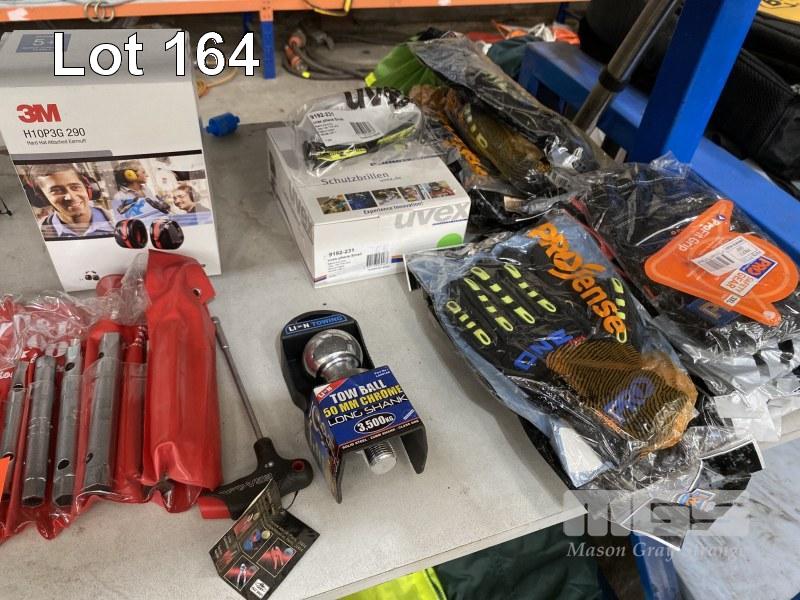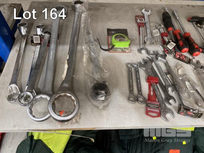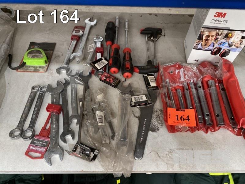 ASSORTED NEW HAND TOOLS, SIDCHROME, RING & OPEN SPANNERS, UP TO 1 1/4", DRIVES, GLOVES, GOGGLE, ETC, 1 x SHELF