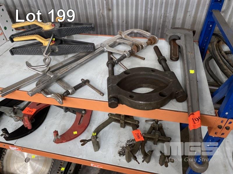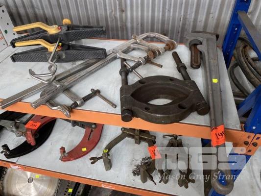 PIPE WRENCH, 900mm , 3 x SLIDING CLAMPS, TRADEMASTER, 750 & 500mm, BEARING GEAR PULLER/SPLITTER, 200mm & 2 x SAFETY CLAMPS
