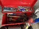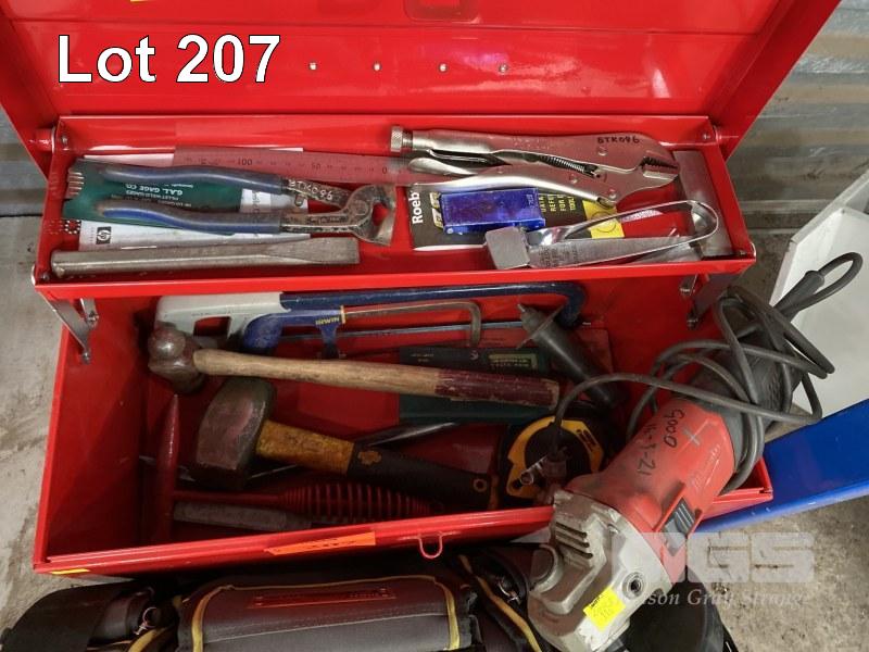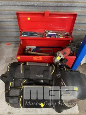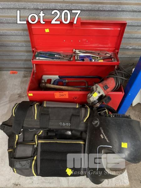 TOOL BOX & CONTENTS INCLUDING MILWAUKEE ANGLE GRINDER, HAMMERS, VICE GRIPS, SAWS, TOOL BAG, AUTO TINT WELDING HELMET, ETC