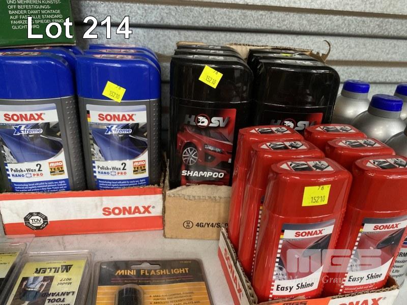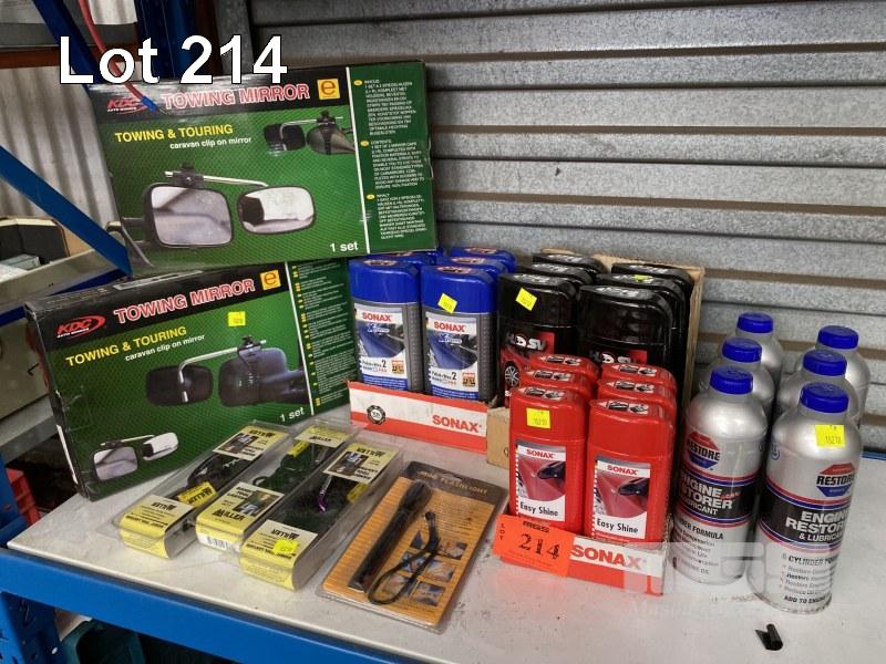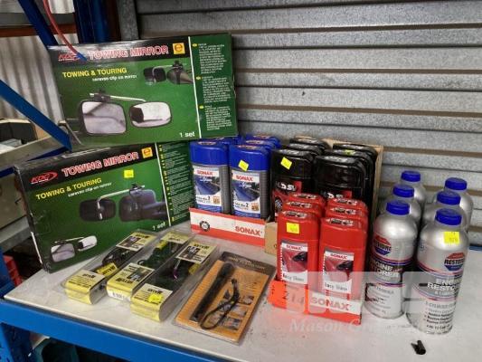 ASSORTED AUTOMOTIVE PRODUCTS INCLUDING: 6 x BOTTLES HSV SHAMPOO, 6 x BOTTLES SONAX 2 IN 1 CAR SHAMPOO, 6 x BOTTLES SONAX EASY SHINE, 6 x BOTTLES AUTO RESTORE ENGINE OIL ADDITIVE, 2 x TOWING SIDE MIRRORS, TOOL LANYARDS & TORCH