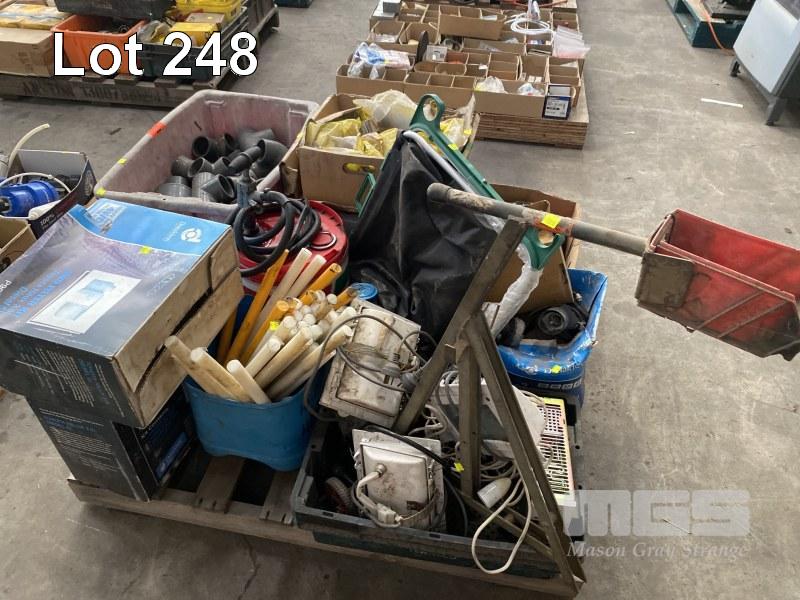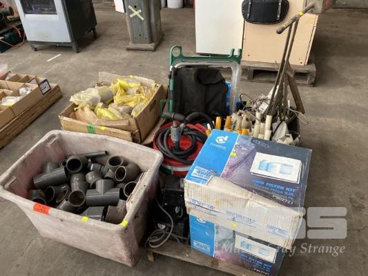 DRUM PUMP, 20 LITRE, COMPOSITE HANDLES, STRAPPING DISPENSER, LIGHTING, ASSORTED FILTERS, PVC PIPE JOINTS, ETC,