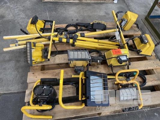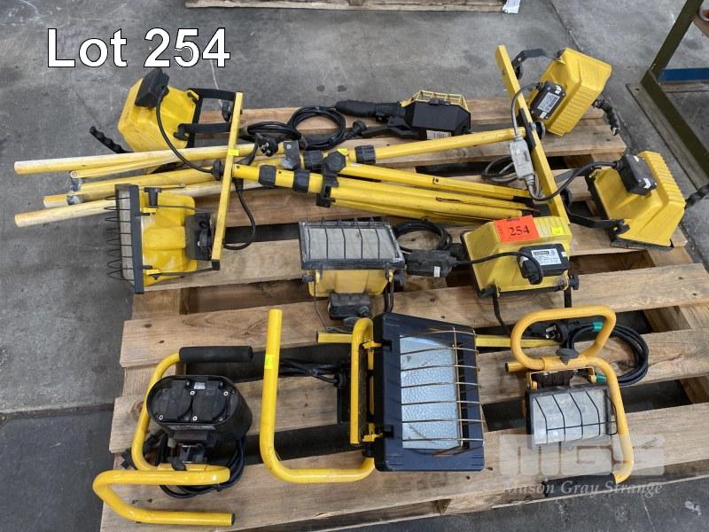 2 x TRIPOD WORK LIGHTS, HALOGEN TWN LAMP, 4 x SINGLE LAMP & POWER JUNCTION BOX, 240V
