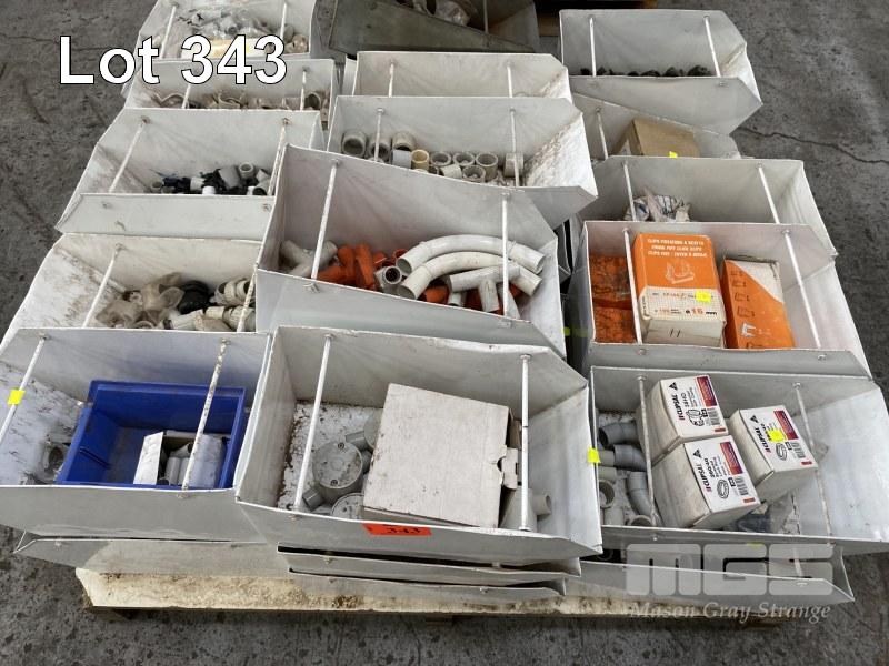 ASSORTED ELECTRICAL CONDUIT FITTINGS, CLIPS, LOCK RINGS, SADDLES, JUNCTION BOXES, ETC IN STACKABLE STEEL PARTS DRAWERS
